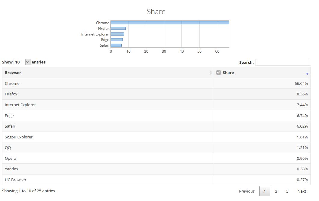 在浏览器方面,谷歌浏览器的市场份额略有下降。该网络浏览器现在占有66.64%的市场份额,其次是Mozilla Firefox,市场份额为8.36%。微软的Internet Explorer和Edge分别以7.44%和6.74%的市场份额排名第三和第四。排名第五的是苹果的Safari,其市场份额为6.02%。