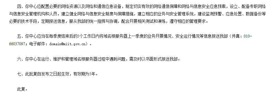 五、你中心应当在每季度结束后的5个工作日内将域名根服务器上一季度的业务开展情况、安全运行情况等信息报送我部(传真:010-66037097;电子邮件:[email protected])。