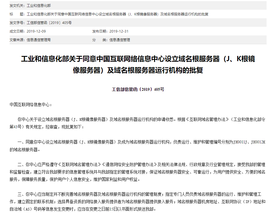 工业和信息化部关于同意中国互联网络信息中心设立域名根服务器(J、K根镜像服务器)及域名根服务器运行机构的批复。工信部信管函〔2019〕405号 中国互联网络信息中心: