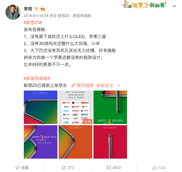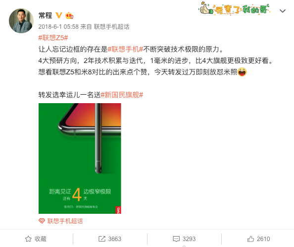 2018年6月,在联想Z5发布会上,常程拿联想新机全程对比小米8,最后还在微博称“比米8好的更是不只一点”。