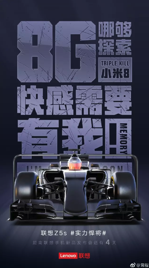 此后,几乎一到联想新机发布的前后脚,常程就要“碰一碰瓷”。2018年12月联想放出海报,剑指小米8探索版,强调运行内存8GB不够用,暗示联想Z5s会采用10GB运行内存。
