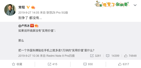 今年9月,小米集团副总裁卢伟冰回应“余承东说环绕屏没有实用价值”一事时,常程接机蹭了一波热度,对小米和华为进行了双重否定。