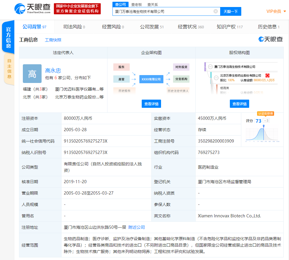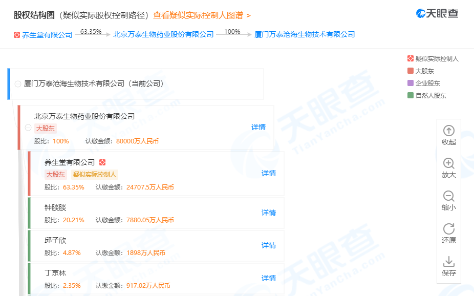 天眼查数据显示,厦门万泰成立于2005年3月,注册资本8亿人民币,公司经营范围包括生物药品制造;医疗诊断、监护及治疗设备制造;其他基础化学原料制造(不含危险化学品和监控化学品及非药品类易制毒化学品)等。该公司由北京万泰生物药业股份有限公司全资持股,后者的大股东为养生堂有限公司。
