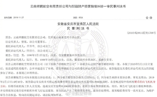 根据中国裁判文书网的一份判决材料显示,祥鹏航空公司起诉陆某其行为造成损失总计12余万元并得到了法院的支持。