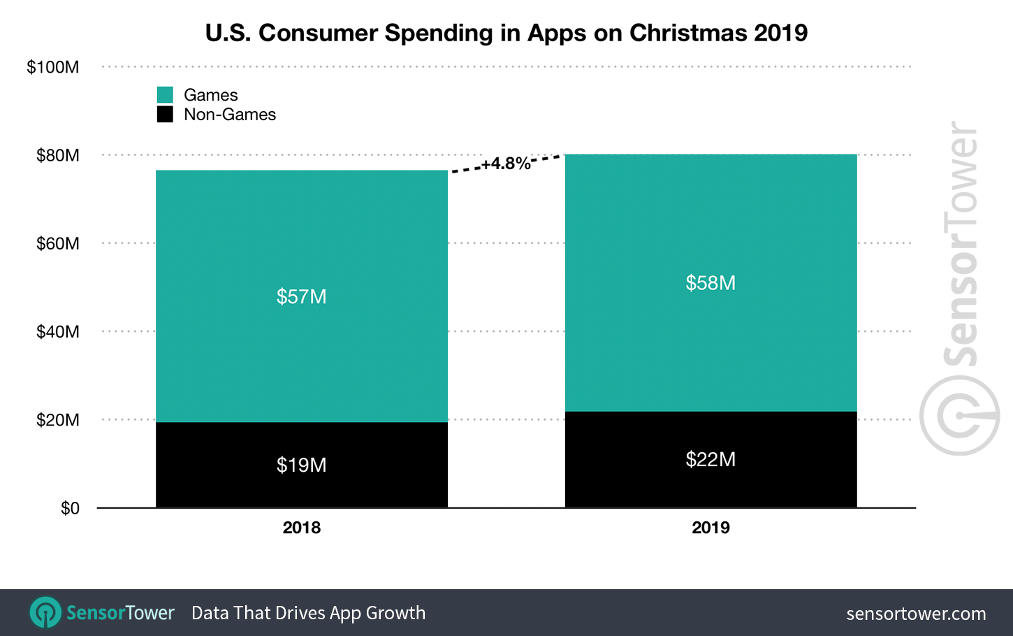 Sensor Tower称,2019年12月份App Store和Google Play这两家应用商店总营收中,约5%来自圣诞节。2019年12月份这两家应用商店的总营收接近51亿美元,比2018年12月的约47亿美元高出8%。