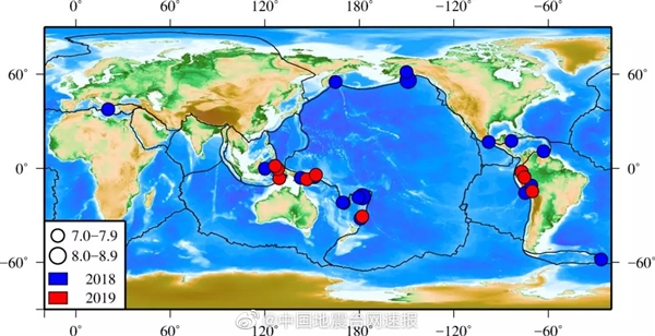 根据中国地震台网的数据汇总,2019年全球发生6.0级及以上地震共115次,其中7.0级及以上只有9次,最高为7.8级,5月26日发生在秘鲁北部,无一达到或超过8.0级。中国地震台网指出,2019年全球7.0级及以上地震频次少、强度低,打破了2004-2018年全球每年都有8级以上地震发生的强活动状态。