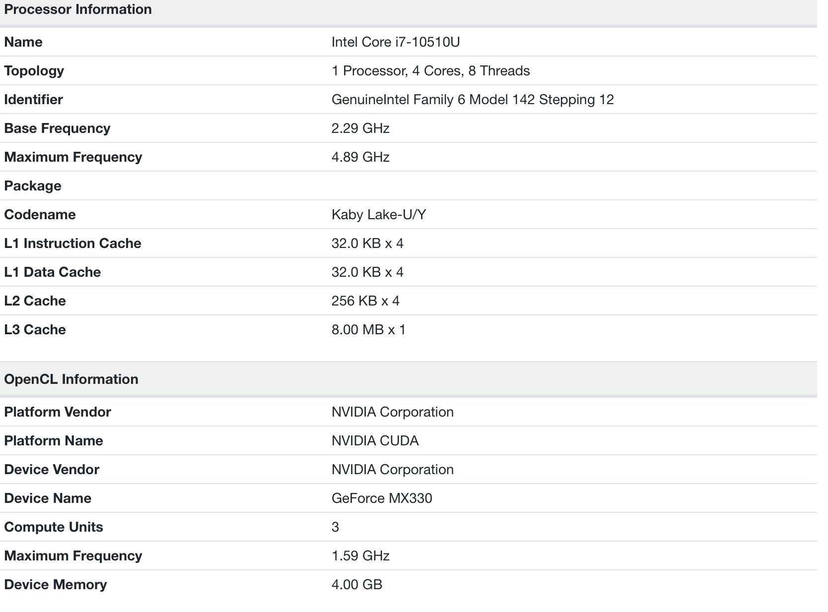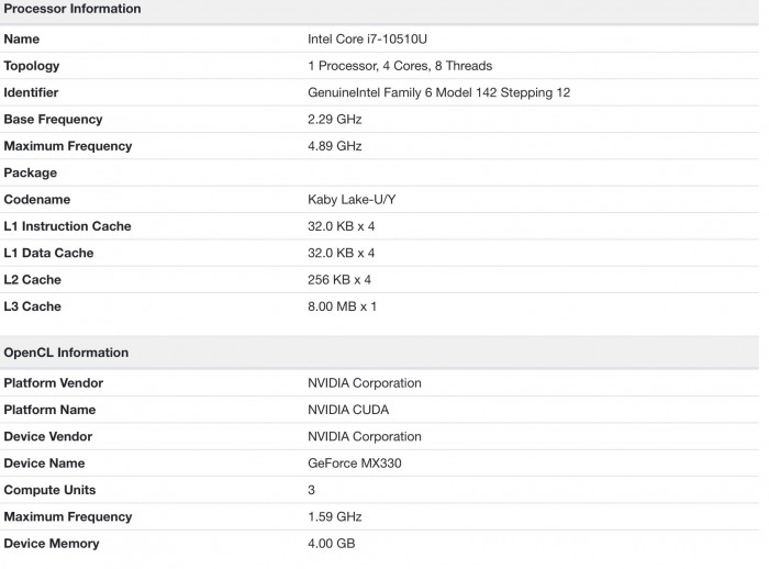 今天,我们又在GeekBench测试数据库中看到了MX330,来自一台惠普Envy x360翻转本,检测规格显示有3组计算单元,也就是384个流处理器,搭配4GB显存(应该是GDDR5),搭配十代酷睿i7-10510U。