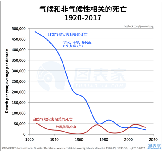 根据国际灾害数据库的数据,2000-09年至2010-15年间,每年因气候相关灾害导致的死亡人数下降了三分之一,每10万人中只有0.35人死亡——自上世纪60年代以来减少了95%。这并不是因为灾难少了,而是因为我们有了更好的应对能力。