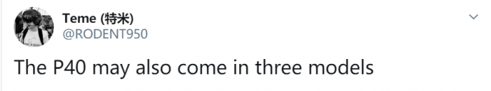 爆料人士@RODENT950透露,P40系列可能会包含三款。有网友猜测,P40系列包括P40 Lite、P40和P40 Pro这三款。@RODENT950予以否认,表示P40系列这三款全是旗舰型号,并不包含“Lite”。目前可以确定的是,P40系列有P40标准版、P40 Pro两款。如果有第三款的话,它可能是特别版,也可能是大屏版(P40 Pro Max?)。