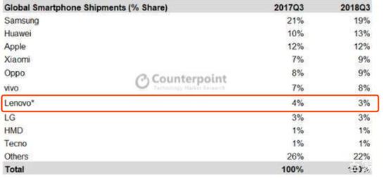 据调研机构Counterpoint数据显示,联想手机一直用性价比挽回市场,但在2018年Q3季度中,其全球出货量为3%,同比下降了1%,而友商的份额却在同比提高。