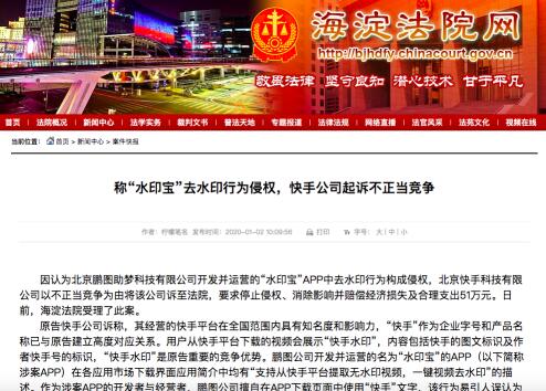 1月3日消息,据海淀法院网消息,因认为北京鹏图助梦科技有限公司开发并运营的“水印宝”APP中去水印行为构成侵权,北京快手科技有限公司以不正当竞争为由将该公司诉至法院,要求停止侵权、消除影响并赔偿经济损失及合理支出51万元。