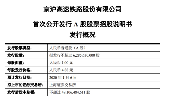 中国最赚钱高铁即将在A股上市了。去年11月,京沪高铁仅用了23天过会,超过了近10年来“最快”的工业富联。1月3日凌晨,京沪高速铁路股份有限公司(以下简称“京沪高铁”)发布《首次公开发行股票发行公告》。根据公告,本次发行价格4.88元/股,此价格对应的市盈率为23.39倍,低于交通运输大行业主要上市公司静态市盈率均值。