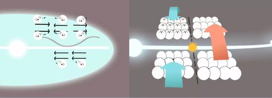 如图三所示,两个恒星队伍(运动子结构)展示了银盘上太阳附近及距离太阳1.6万光年远的恒星运动特点。左边是一个称为“北近结构”的恒星队伍,向人类清楚展示出他们在银心水平方向上的运动趋势;右边的恒星队伍是一组在太阳附近的不对称结构,图中展示了这里的恒星在垂直方向上的步伐特点。