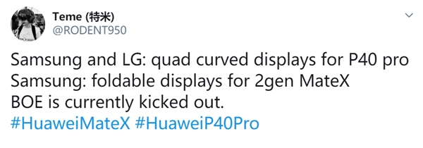 1月3日消息,爆料人士RODENT950透露,P40 Pro的四曲面屏由三星、LG Display供货。该爆料透露了一个重要信息点:P40 Pro可能会使用曲面屏。从Mate 20系列开始,华为旗舰Pro版采用的都是曲面屏,像Mate 20 Pro、P30 Pro、Mate 30 Pro等,因此P40系列有可能会延续这一策略,使用曲面屏,而且有可能是双曲面挖孔屏。