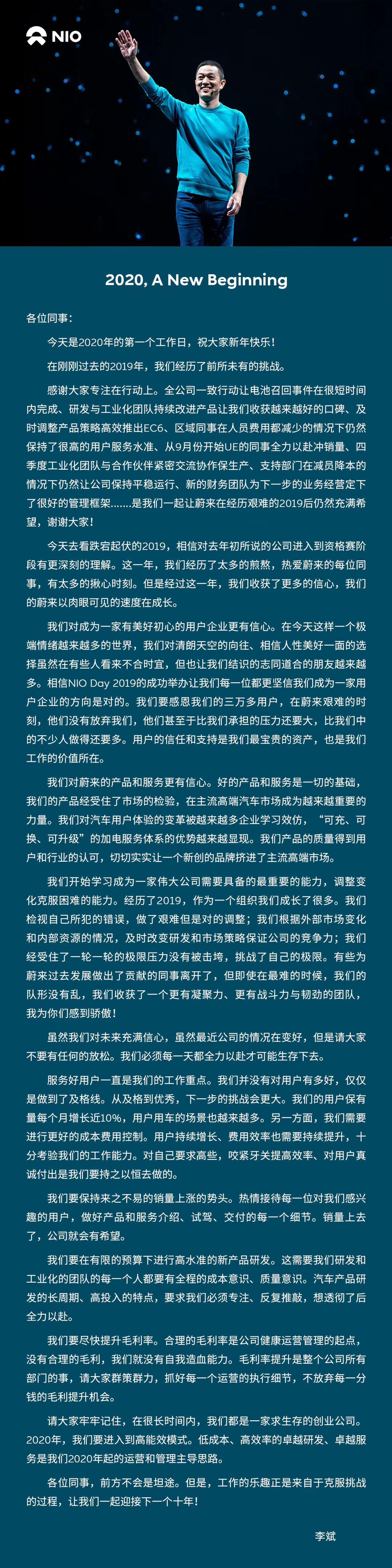1月2日,蔚来汽车董事长李斌在向员工发表的内部信中表示,“在刚刚过去的2019年,我们经历了前所有未有的挑战。”并感谢同事在电池召回事件等重大事件发生时的快速反应和积极应对。