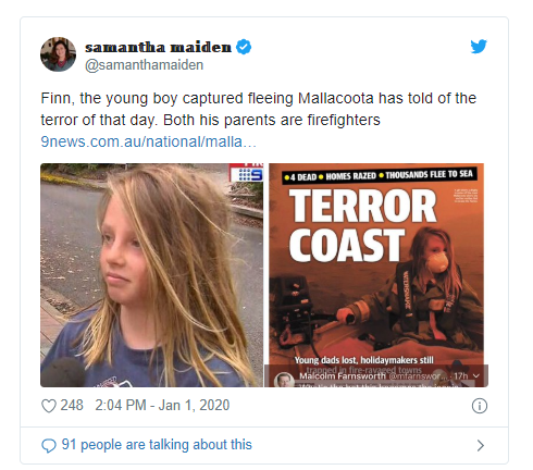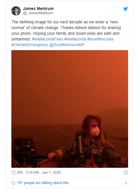 来自维多利亚东部小镇Mallacoota的民众发布了大量照片,在圣诞节期间,通常当地会吸引大量游客。12月31日,大约4000人被迫下湖避开山火。