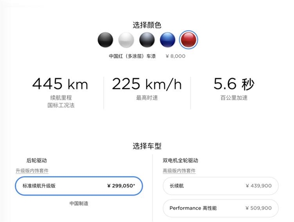 除此之外,国产Model 3的各项选配件也有一定的下调。比如新车将标配纯黑色车漆(此前选配需9500元);珍珠白、冷光银、深海蓝、中国红车漆选装价为8000元(此前为18900元);19英寸轮圈选装价为6000元(此前为14200元)。