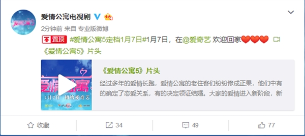1月3日下午,爱情公寓电视剧官方宣布:《爱情公寓5》定档,1月7日爱奇艺全网独播。据了解,《爱情公寓5》将会是这个系列的最终季,剧集的拍摄工作在今年的8月24日已经正式结束,最终季一共有36集。