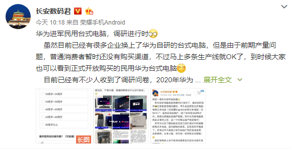 根据部分网友反馈的信息,他们已经收到了来自华为公司的调研报告,报告中邀请消费者发表自己对华为推出台式电脑的看法和需求。从这个情况可以看出,华为民用台式电脑计划已在进行当中。
