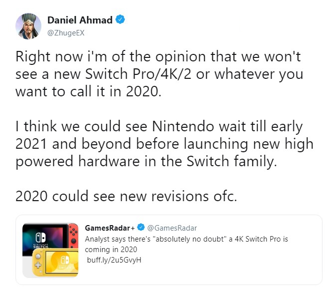 可是,虽然Serkan Toto之前成功预测了Switch Lite,但是他的这个观点遭到了业界另一位著名分析师Daniel Ahmad的反驳,Daniel Ahmad在推特中否定了任天堂会在2020年推出新的Switch主机这一观点。