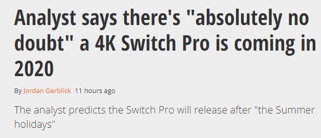 除了支持4K分辨率之外,Serkan Toto还表示Switch Pro将采用“强化版”的硬件,使用更大的游戏卡带,价格为399美元。 如果这位分析师的预测再一次应验了,那么在PS5和Xbox Series X两台次世代主机推出之前,大家就会看到任天堂推出新的主机。