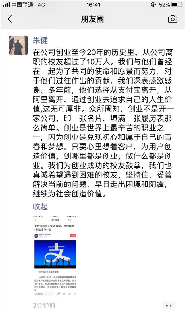 1月3日,针对有媒体报道称支付宝前员工涉嫌非法吸储被抓,支付宝客户与公众沟通部总监朱健在朋友圈回应称:通过创业追求人生价值无可厚非,但创业不是开一家公司,印一张名片,填满一张履历那么简单,而是有没有心里想着客户,为客户创造价值。