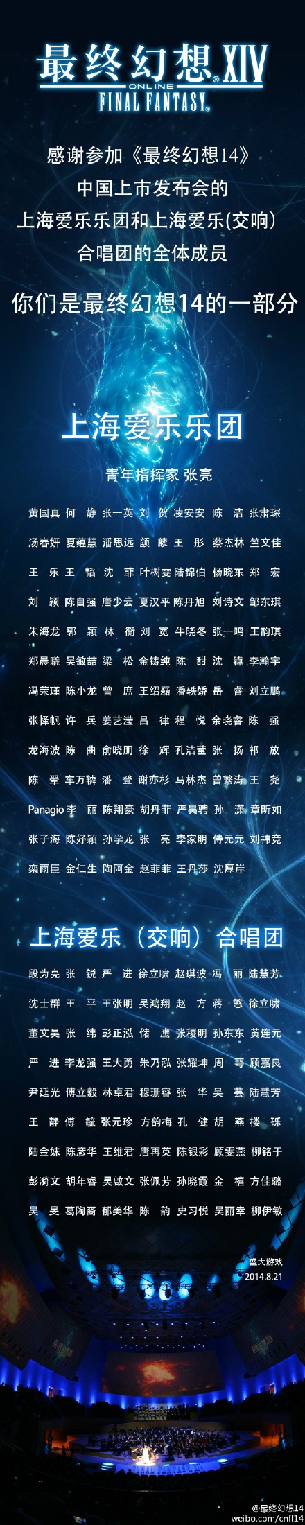 值得一提的是,《最终幻想》交响音乐会早在2014年8月20日就来到过中国。当时时值《最终幻想14》中国上市发布会,盛大游戏将《最终幻想》交响音乐会首次带到了中国,上海爱乐乐团 和上海爱乐(交响)合唱团的精彩演出震撼全场。