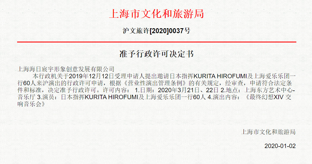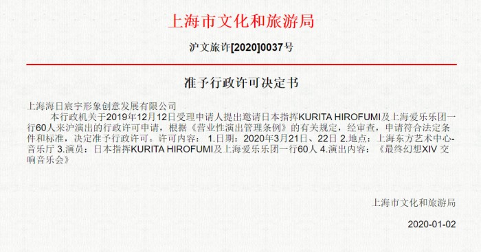 近日上海市文化和旅游局批准了中国上海某公司邀请日本指挥Kurita Hirofumi以及上海爱乐乐团一行60人来沪演出的行政许可申请,这意味着《最终幻想14》交响音乐会已经通过了相关行政许可,可如期举行。