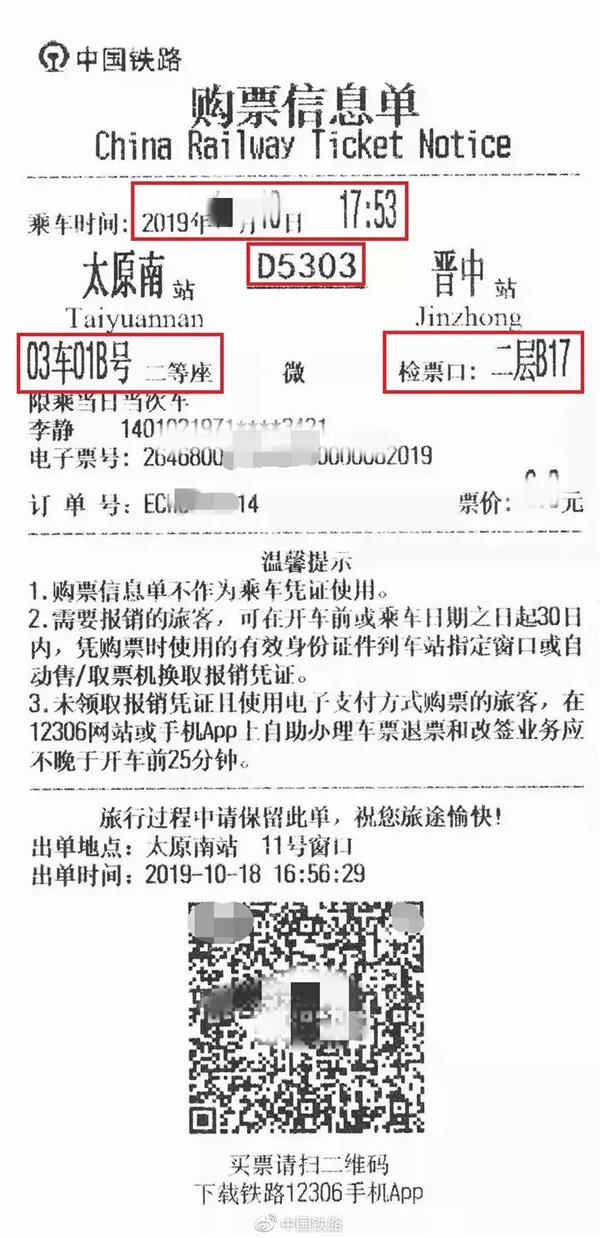 旅客还可以使用微信扫描报销凭证上的二维码查询车次、席位等信息,如下图所示。