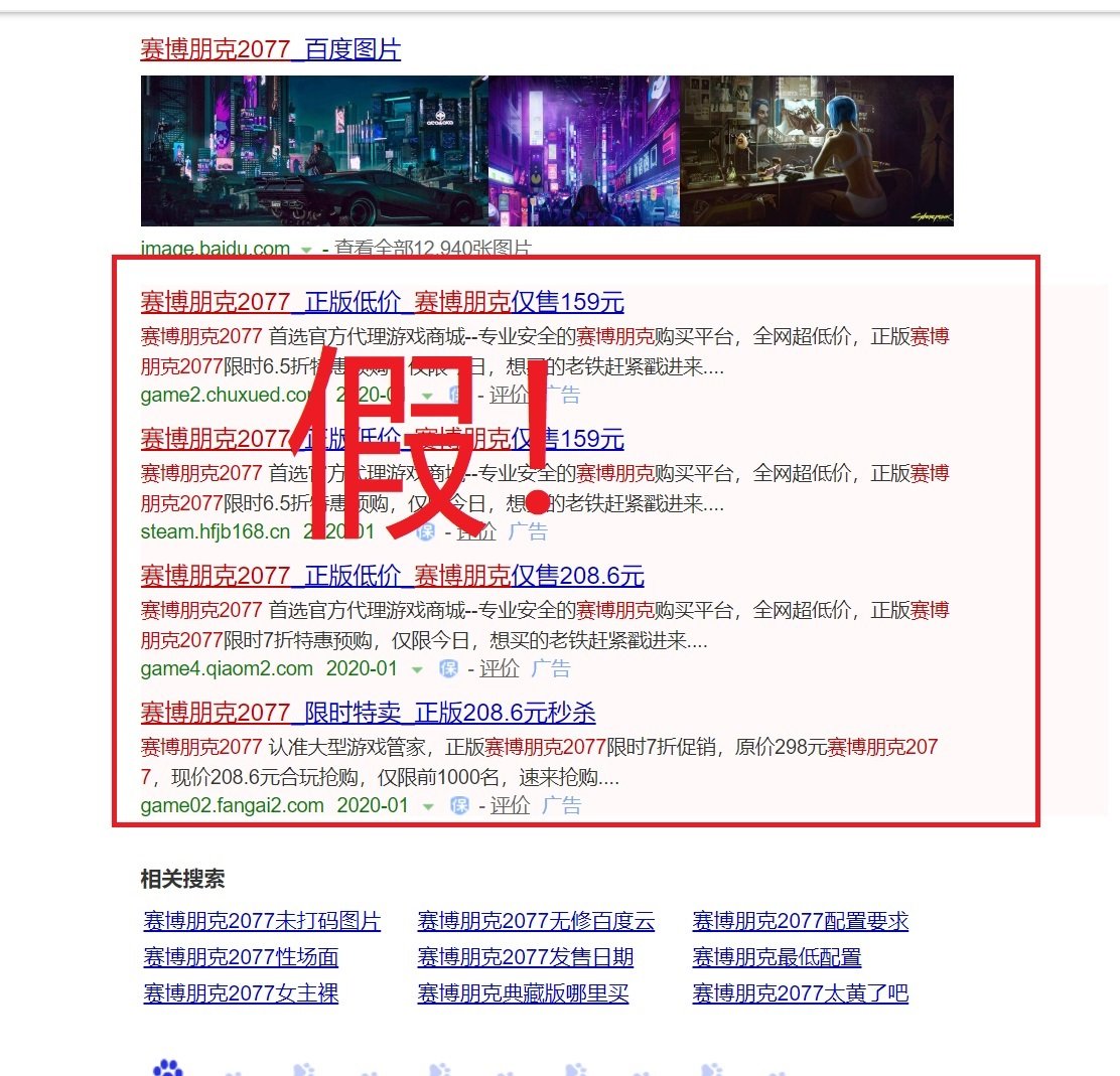 不过截止到发稿时,我们在百度搜索“赛博朋克2077”,首页结果并未出现以上虚假广告。