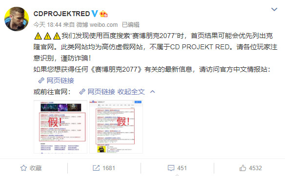 今晚CDPR官微提醒粉丝,在百度搜索“赛博朋克2077”时首页结果可能会出现克隆官网,而这类网站均为“高防虚假网站”,不属于CDPR,谨防诈骗。同时CDPR还发布了两个截图,展示了大量含有“赛博朋克2077”和“赛博朋克”等关键词的广告网站。