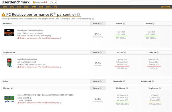 今天,UserBenchmark数据库里又出现了一款更高端的“锐龙7 4800U”,同样是8核心,但是有16线程,我们将第一次在轻薄本上看到16个框框。
