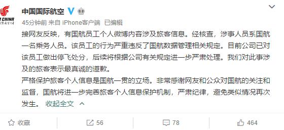 “接网友反映,有国航员工个人微博内容涉及旅客信息。经核查,涉事人员系国航一名乘务人员。该员工的行为严重违反了国航数据管理相关规定。目前公司已对该员工做出停飞处分,后续将根据公司有关规定进一步严肃处理。我们对此事涉及的旅客表示最真诚的道歉。