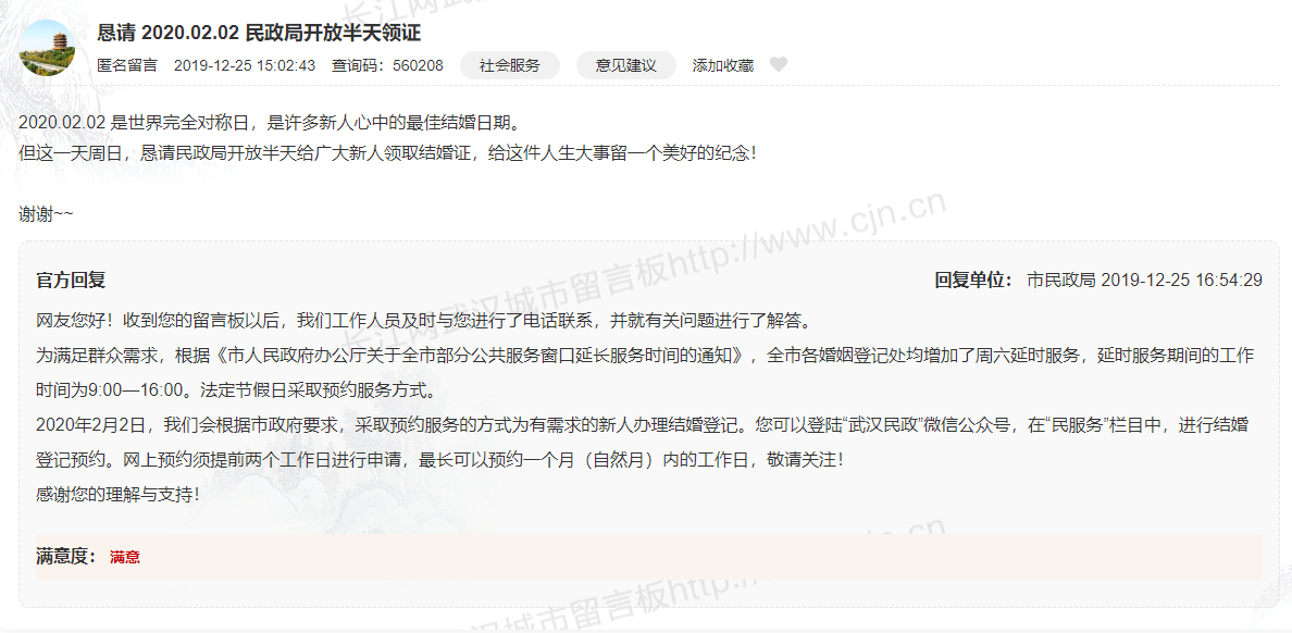 然而,2020年2月2日是周末,一般来说民政部门并不上班。不过笔者从武汉市民政局官微获悉,当地已临时决定2020年2月2日开放预约办理。延时服务期间的工作时间为9:00-16:00,法定节假日采取预约服务方式。