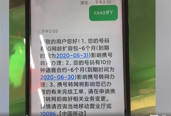 张女士说:“12月18日我想携号转网,就给移动发了一个短信,得到移动的短信回复是符合携号转网的条件,结果到晚上的时候突然收到短信,莫名其妙的添加了2个套餐,结果我再查询时就得到回复不能携号转网了。”
