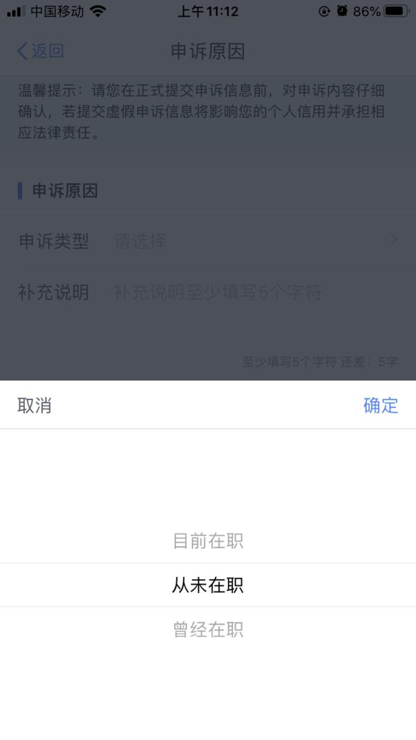 申诉类型可以选择:目前在职、从未就职、曾经在职。