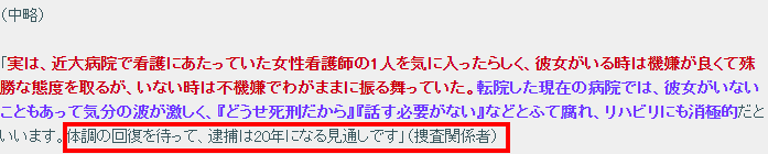 ·除了高额的医疗费用,日媒日还曝出了这位穷凶极恶的罪犯“人性”的一面,传出青叶真司似乎恋上某位温柔女护士,这位女护士当值的时候会变得无比的温顺,而别的护士当值就会恢复暴虐的本性。