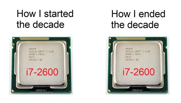 2020年的到来意味着21世纪第二个十年结束了,人类要进入第三个十年了,这段时间免不了有各种回顾、怀旧的。就CPU来说,现在的处理器跟十年前的处理器有多大变化?Reddit上有玩家发了一张很有意思的图,自嘲十年前开始的时候用酷睿i7-2600K,现在还是在用酷睿i7-2600K。