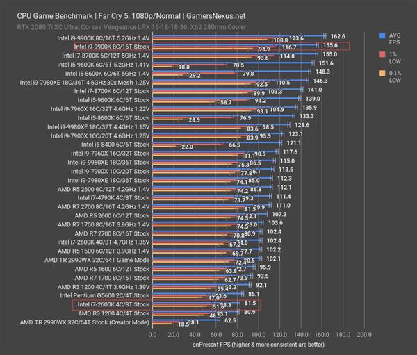 至于酷睿i7-2600K的性能,国内外网站这两年来实际上做过不少对比酷睿i7-2600K与酷睿i9-9900K的性能的,尤其是游戏性能,GameNexus之前测试的结果如上所示,酷睿i7-2600K在孤岛5中的平均帧约为82fps,酷睿i9-9900K可以达到156,差不多就是前者的两倍,不过它的核心数、频率也要高得多,这么一算的话,这十年来的变化确实让人觉得不爽。