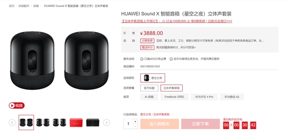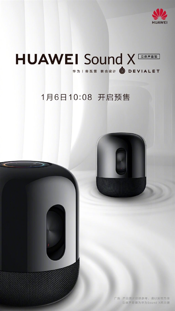 1月6日消息,华为Sound X立体声套装今日10:08开启预售,售价3888元(包含一对音箱主机)。华为商城显示,支付定金100元可抵300元,到手价为3688元。官方介绍,Sound X由华为与帝瓦雷联合设计,其设计灵感源于维也纳音乐金色大厅。它采用全对称美学设计,音箱尺寸为165mm(直径)×203mm(高度),重量为3.5kg,使用NCVM不导电真空电镀工艺,其优势在于拥有金属质感、光亮通透,同时不影响无线信号传输,耐磨、耐醇、耐汗。