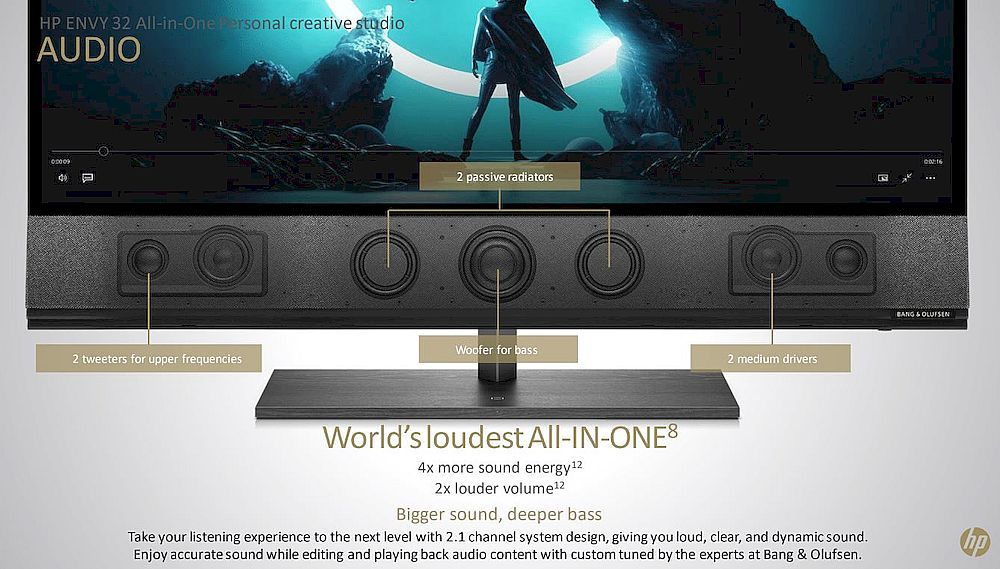 ENVY 32另一个亮点就是音频设置。惠普表示ENVY 32是全球音量最响的一体机,也是全球首款通过Advanced Audio Stream的一体机。您可以通过Bang&Olufsen定制的内置前置高音扬声器和低音炮扬声器欣赏美妙的声音。 HP还使您可以轻松地将音乐从手机传输到PC扬声器,即使PC处于关闭状态也能如此操作。