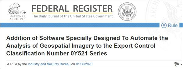 2020年1月6日,美国商务部下属的工业和安全局(BIS)在美国《联邦公报》(Federal Register)上发布新的出口管制措施:自1月6日起,美国企业出口某些地理空间图像软件时必须得到许可,才能将软件发送到海外(加拿大除外)。根据文件要求,应用于智能化传感器、无人机、卫星和其他自动化设备的目标识别软件(无论民用或军用)都在限制范围之内。