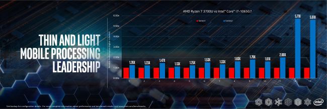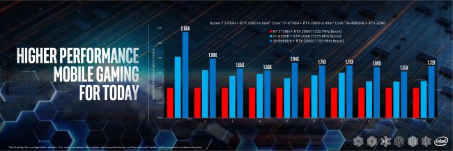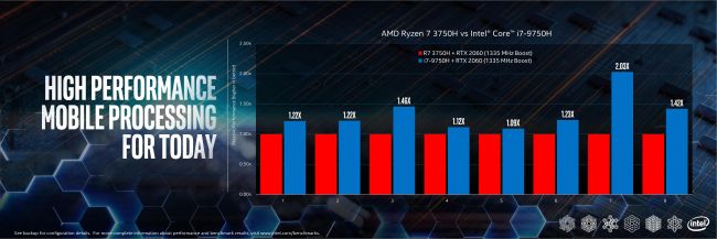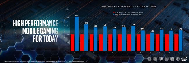 另外,Intel顺便对比了九代酷睿i7-9750H、AMD锐龙7 3750H的性能,都搭配RTX 2060的时候办公和应用性能整体领先22%,最高可达103%,实际游戏性能领先最多50%,而且酷睿i7-9750H还有搭配RTX 2080的机型可选,游戏性能更是可领先最多84%。