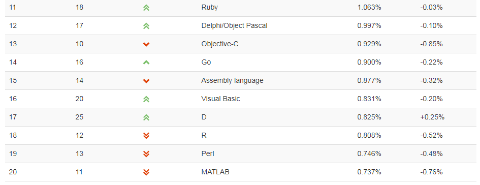 其他一些表现不错令人惊喜的编程语言:Swift(从第 15 名上升至第 9 名)和 Ruby(从第 18 名上升至第 11 名)。Swift 也已是稳定排名前十的编程语言,而 Ruby 也似乎很快就会进入 TOP 10。