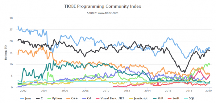 TOP 10 编程语言 TIOBE 指数走势(2002-2020)