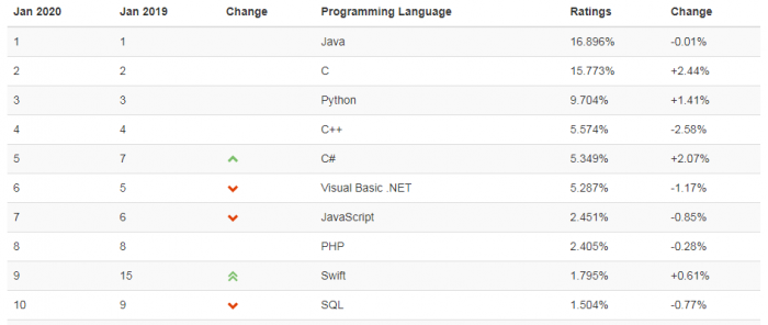 不少人认为 Python 会连续两年成为 TIOBE 的年度编程语言,毕竟它的火热程度在近几年是有目共睹。然而这一次偏偏是古老的 C 语言凭借 2.4% 的年增长率获得了此称号。排名第二的是 C# (+2.1%),然后分别是 Python (+1.4%) 和 Swift (+0.6%)。