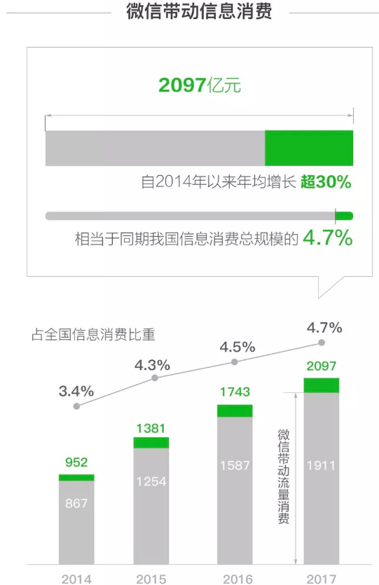 与Facebook相似,微信也是一款免费的社交应用,对我国的社会、经济产生了重大影响。中国信息通信研究院产业与规划研究所发布的2017年数据显示,微信拉动信息消费2097亿元——占到我国当年GDP(820754亿元)的约0.26%,占到同期我国信息消费总额的4.7%。另外,微信还带动传统消费3339亿元——占到GDP的0.4%。微信还带动社会就业规模2030万人,其中直接就业496万人,间接就业1534万人。调查还显示,93.8%的用户表示微信给生活带来了便利。