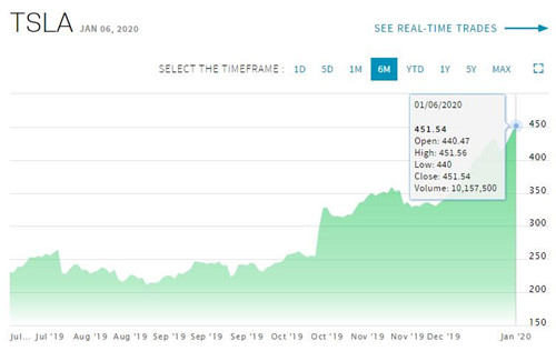 周一收盘时的451.54美元,是特斯拉股票收盘价首次超过450美元,收盘价也再次创下了新高。