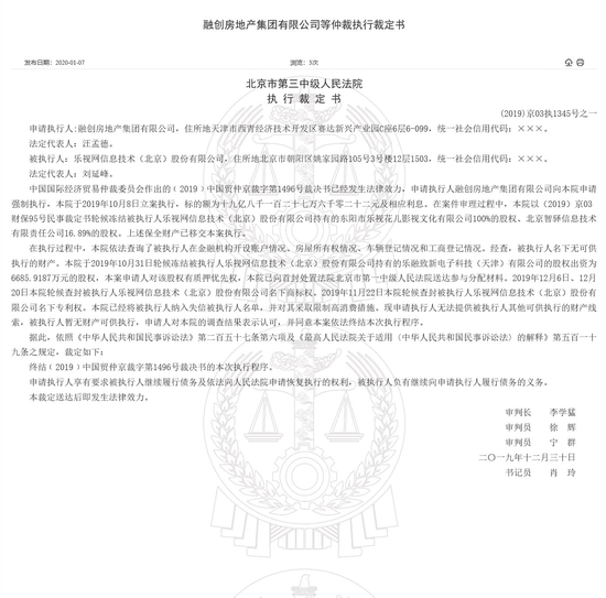 1月7日上午消息,中国裁判文书网显示,融创房地产集团此前向法院申请对乐视网进行强制执行一案,日前已终结执行程序,乐视网所欠19.8亿元及利息尚未追回。根据法院裁定,法院已轮候冻结乐视网所持乐融致新6685.9万元股权,融创房地产对该股权有质押优先权。