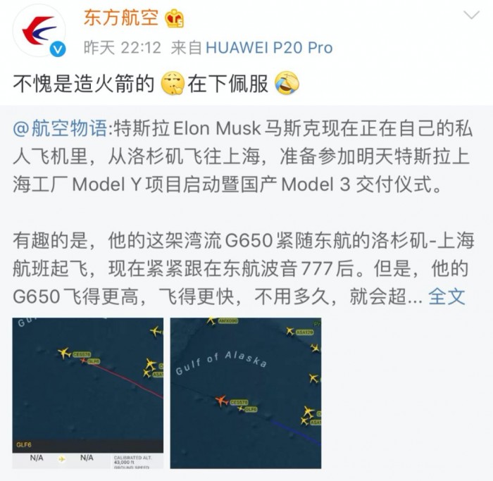 太平洋上空。一架来自东航的波音777正从洛杉矶飞往上海。在它身后更高空约13000英尺处,一架湾流 G650公务机正同样飞往上海。不久后,飞得更高更快的湾流 G650 超越了波音777,抢先抵达上海:这是一架私人飞机,它的主人 Elon Musk 今天特意来中国参加国产 Model 3 的交付仪式。